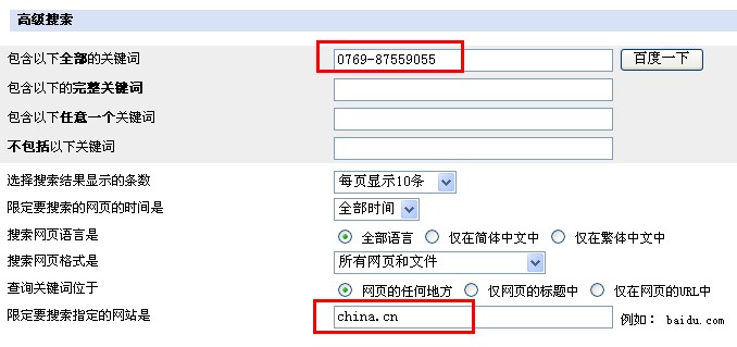 那么我們就在包含以下全部的關(guān)鍵詞 的框里面,填寫這個(gè)唯一性的字符,在限定要搜索指定的網(wǎng)站 里面輸入B2B網(wǎng)站的域名。