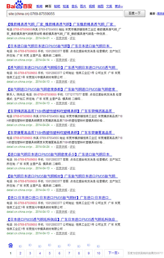 這樣我們搜索出來(lái)的就是 china.cn 這個(gè)網(wǎng)站里面所有包含 0769-87559055 電話的,并且被百度搜錄的信息。我們看一下收錄條數(shù),就能知道,發(fā)帖的效果了!如果我們發(fā)布1000條,能搜錄800條,說(shuō)明效果還是很好的,要想百度有排名,首選得有收錄,這樣才有機(jī)會(huì)排到首頁(yè),如果連收錄量都沒(méi)有,也談不上排名了!